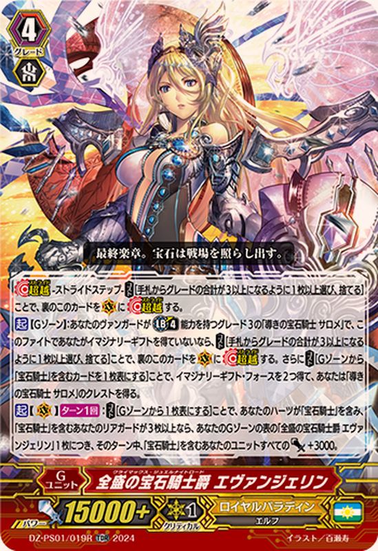 【超越】-ストライドステップ-【コスト】[手札からグレードの合計が3以上になるように1枚以上選び、捨てる]ことで、裏のこのカードを(V)に【超越】する。【起】【Gゾーン】:あなたのヴァンガードが【リミットブレイク】(4)能力を持つグレード3の「導きの宝石騎士 サロメ」で、このファイトであなたがイマジナリーギフトを得ていないなら、【コスト】[手札からグレードの合計が3以上になるように1枚以上選び、捨てる]ことで、裏のこのカードを(V)に【超越】する。さらに【コスト】[Gゾーンから「宝石騎士」を含むカードを1枚表にする]ことで、イマジナリーギフト・フォースを2つ得て、あなたは「導きの宝石騎士 サロメ」のクレストを得る。【起】【(V)】【ターン1回】:【コスト】[Gゾーンから1枚表にする]ことで、あなたのハーツが「宝石騎士」を含み、「宝石騎士」を含むあなたのリアガードが3枚以上なら、あなたのGゾーンの表の「全盛の宝石騎士爵 エヴァンジェリン」1枚につき、そのターン中、「宝石騎士」を含むあなたのユニットすべてのパワー+3000。