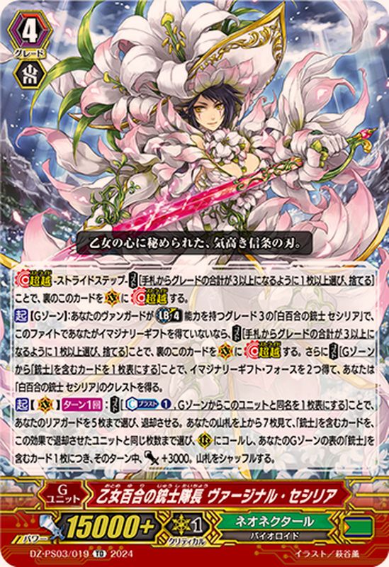 【超越】-ストライドステップ-【コスト】[手札からグレードの合計が3以上になるように1枚以上選び、捨てる]ことで、裏のこのカードを(V)に【超越】する。【起】【Gゾーン】:あなたのヴァンガードが【リミットブレイク】(4)能力を持つグレード3の「白百合の銃士 セシリア」で、このファイトであなたがイマジナリーギフトを得ていないなら、【コスト】[手札からグレードの合計が3以上になるように1枚以上選び、捨てる]ことで、裏のこのカードを(V)に【超越】する。さらに【コスト】[Gゾーンから「銃士」を含むカードを1枚表にする]ことで、イマジナリーギフト・フォースを2つ得て、あなたは「白百合の銃士 セシリア」のクレストを得る。【起】【(V)】【ターン1回】:【コスト】[【カウンターブラスト】(1),Gゾーンからこのユニットと同名を1枚表にする]ことで、あなたのリアガードを5枚まで選び、退却させる。あなたの山札を上から7枚見て、「銃士」を含むカードを、この効果で退却させたユニットと同じ枚数まで選び、(R)にコールし、あなたのGゾーンの表の「銃士」を含むカード1枚につき、そのターン中、パワー+3000。山札をシャッフルする。