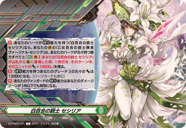 【永】:あなたのハーツが【リミットブレイク】(4)能力を持つ「白百合の銃士 セシリア」なら、あなたの(V)の「乙女百合の銃士隊長 ヴァージナル・セシリア」は、あなたのハーツが元々持つ能力すべてと『【自】【(V)】:あなたの「白百合の銃士 セシリア」が山札から(R)に登場した時、1枚引き、そのターン中、そのユニットのパワー+10000。』を得る。【永】:【リミットブレイク】(4)能力を持つあなたのグレード3の元々のパワーは13000になる。(ハーツカードも含む)【永】:あなたのヴァンガードの【リミットブレイク】(4)能力はあなたのダメージゾーンが3枚以下でも有効になる。