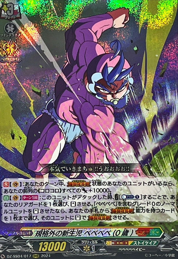 【永】【(V)】:あなたのターン中、【爆裂成長期】状態のあなたのユニットがいるなら、あなたの前列の《コロコロ》すべてのパワー+10000。【自】【(V)】【ターン1回】:このユニットがアタックした時、【コスト】[【カウンターブラスト】(1)]することで、あなたのリアガードを1枚選び、【スタンド】させる。「ベベベベ」を含むグレード0のノーマルユニットを【スタンド】させたなら、あなたの手札から【爆裂成長期】能力を持つカードを1枚まで選び、そのユニットに【スタンド】で【爆裂成長期】させる。