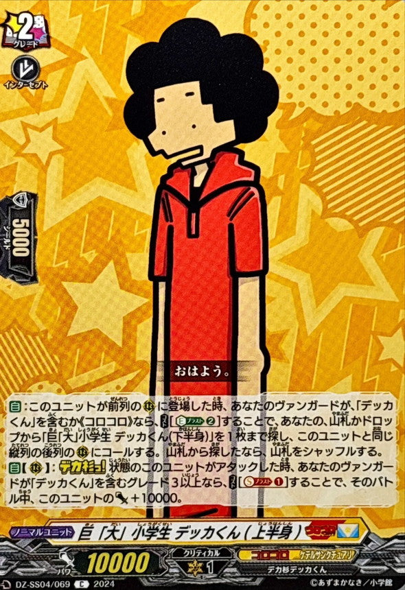 【自】:このユニットが前列の(R)に登場した時、あなたのヴァンガードが、「デッカくん」を含むか《コロコロ》なら、【コスト】[【エネルギーブラスト】(2)]することで、あなたの、山札かドロップから「巨「大」小学生 デッカくん(下半身)」を1枚まで探し、このユニットと同じ縦列の後列の(R)にコールする。山札から探したなら、山札をシャッフルする。【自】【(R)】:【デカ杉っ!】状態のこのユニットがアタックした時、あなたのヴァンガードが「デッカくん」を含むグレード3以上なら、【コスト】[【ソウルブラスト】(1)]することで、そのバトル中、このユニットのパワー+10000。