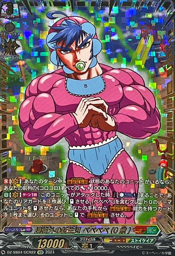 【永】【(V)】:あなたのターン中、【爆裂成長期】状態のあなたのユニットがいるなら、あなたの前列の《コロコロ》すべてのパワー+10000。【自】【(V)】【ターン1回】:このユニットがアタックした時、【コスト】[【カウンターブラスト】(1)]することで、あなたのリアガードを1枚選び、【スタンド】させる。「ベベベベ」を含むグレード0のノーマルユニットを【スタンド】させたなら、あなたの手札から【爆裂成長期】能力を持つカードを1枚まで選び、そのユニットに【スタンド】で【爆裂成長期】させる。