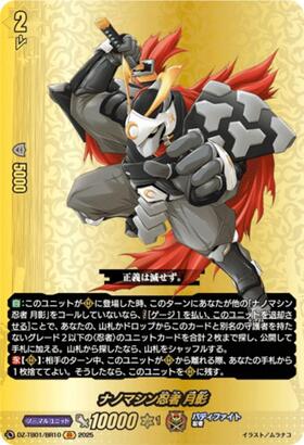 【自】:このユニットが(R)に登場した時、このターンにあなたが他の「ナノマシン忍者 月影」をコールしていないなら、【コスト】[ゲージ1を払い、このユニットを退却させる]ことで、あなたの、山札かドロップからこのカードと別名の守護者を持たないグレード2以下の〈忍者〉のユニットカードを合計2枚まで探し、公開して手札に加える。山札から探したなら、山札をシャッフルする。