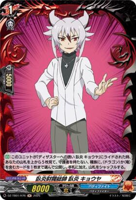 【自】:このユニットが「ディザスターへの誘い 臥炎 キョウヤ」にライドされた時、あなたの山札を上から5枚見て、守護者を持たない、種族に、〈ドラゴン〉か〈竜〉を含むカードを1枚まで選んで公開し、手札に加え、山札をシャッフルする。