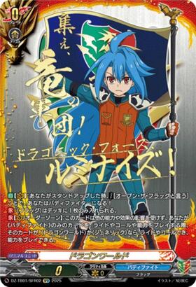 【永】【(V)/オーダーゾーン】:このカードは他の能力や効果の影響を受けず、あなたが《バディファイト》のみのカードを、ライドやコールや能力をプレイする際、そのカードが、〈ドラゴンワールド〉か〈ジェネリック〉なら、ライドやコールでき、能力をプレイできる。