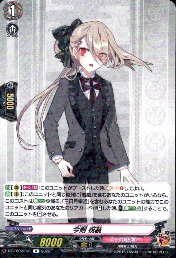 【自】【(R)】:このユニットと同じ縦列に「岩融」を含むあなたのユニットがいるなら、このコストは【エネルギーブラスト】(2)減る。「三日月宗近」を含むあなたのユニットの能力でこのユニットと同じ縦列のあなたのリアガードが【スタンド】した時、【コスト】[【エネルギーブラスト】(2)]することで、このユニットを【スタンド】させる。