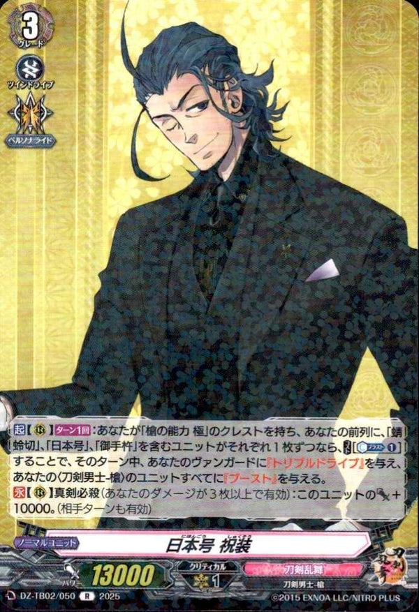 【起】【(R)】【ターン1回】:あなたが「槍の能力 極」のクレストを持ち、あなたの前列に、「蜻蛉切」、「日本号」、「御手杵」を含むユニットがそれぞれ1枚ずつなら、【コスト】[【カウンターブラスト】(1)]することで、そのターン中、あなたのヴァンガードに『トリプルドライブ』を与え、あなたの〈刀剣男士-槍〉のユニットすべてに『ブースト』を与える。