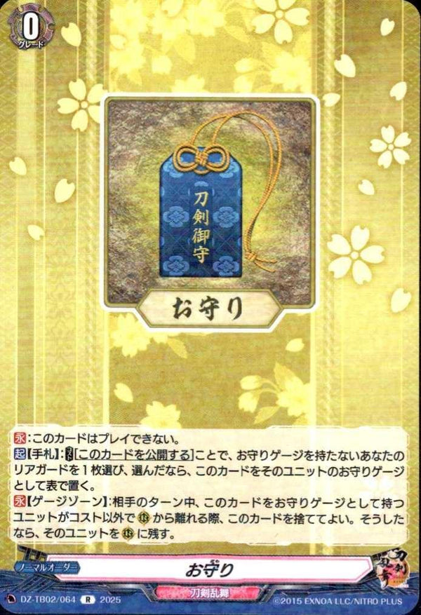 【永】【ゲージゾーン】:相手のターン中、このカードをお守りゲージとして持つユニットがコスト以外で(R)から離れる際、このカードを捨ててよい。そうしたなら、そのユニットを(R)に残す。