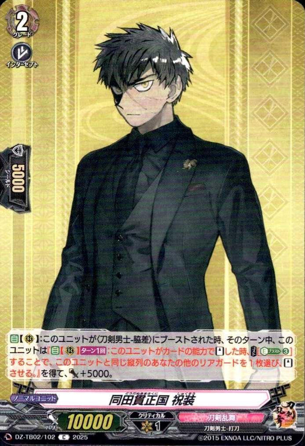 【自】【(R)】:このユニットが〈刀剣男士-脇差〉にブーストされた時、そのターン中、このユニットは『【自】【(R)】【ターン1回】:このユニットがカードの能力で【スタンド】した時、【コスト】[【エネルギーブラスト】(3)]することで、このユニットと同じ縦列のあなたの他のリアガードを1枚選び、【スタンド】させる。』を得て、パワー+5000。