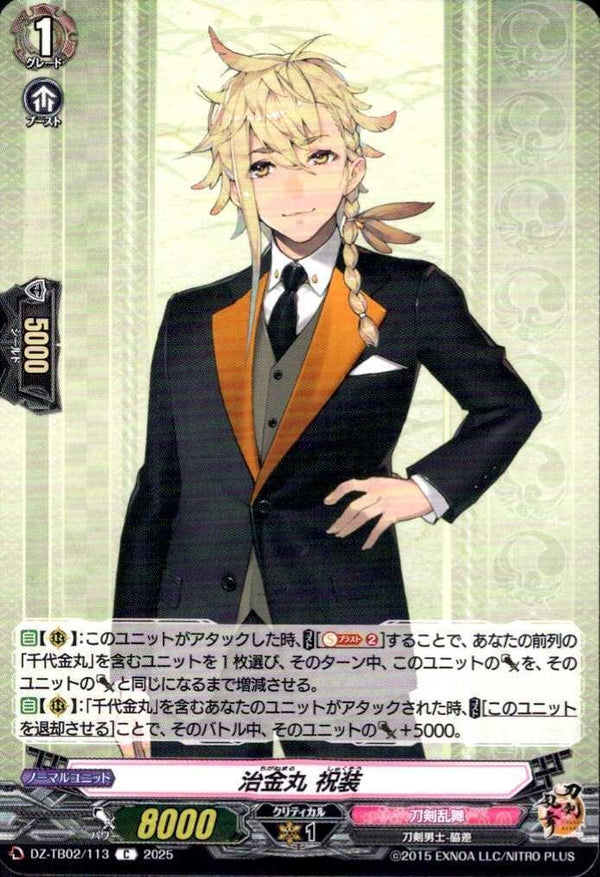 【自】【(R)】:このユニットがアタックした時、【コスト】[【ソウルブラスト】(2)]することで、あなたの前列の「千代金丸」を含むユニットを1枚選び、そのターン中、このユニットのパワーを、そのユニットのパワーと同じになるまで増減させる。