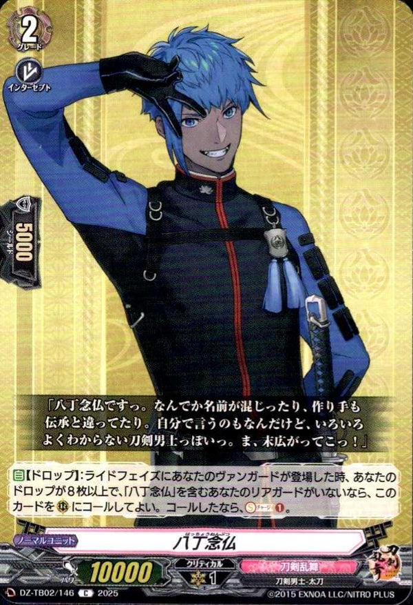 【自】【ドロップ】:ライドフェイズにあなたのヴァンガードが登場した時、あなたのドロップが8枚以上で、「八丁念仏」を含むあなたのリアガードがいないなら、このカードを(R)にコールしてよい。コールしたなら、【ソウルチャージ】(1)。