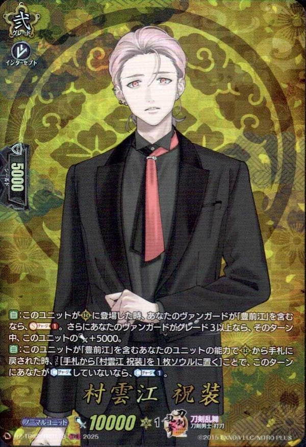 【自】:このユニットが「豊前江」を含むあなたのユニットの能力で(R)から手札に戻された時、【コスト】[手札から「村雲江 祝装」を1枚ソウルに置く]ことで、このターンにあなたが【カウンターチャージ】していないなら、【カウンターチャージ】(1)。