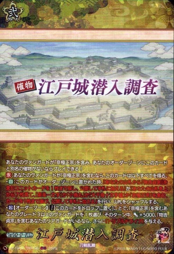 ・【起】【オーダーゾーン】:【コスト】[このカードをドロップに置く]ことで、「京極正宗」を含むあなたのグレード3以上のヴァンガードを1枚選び、そのターン中、パワー+5000。「物吉貞宗」を含むあなたのリアガードがいるなら、さらに『トリプルドライブ』を与える。