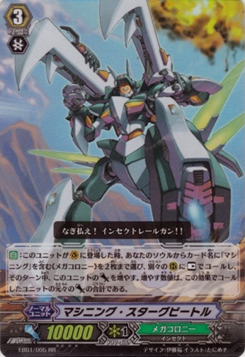 【自】:このユニットが(V)に登場した時、あなたのソウルからカード名に「マシニング」を含む《メガコロニー》を2枚まで選び、別々の(R)に【レスト】でコールし、そのターン中、このユニットのパワーを増やす。増やす数値は、この効果でコールしたユニットの元々のパワーの合計である。