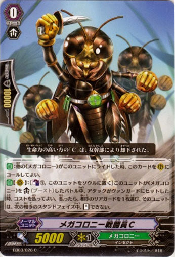 【自】:他の《メガコロニー》がこのユニットにライドした時、このカードを(R)にコールしてよい。【自】【(R)】:[【カウンターブラスト】(1),このユニットをソウルに置く]このユニットが《メガコロニー》を【ブースト】したバトル中、アタックがヴァンガードにヒットした時、コストを払ってよい。払ったら、相手のリアガードを1枚選び、そのユニットは、次の相手のスタンドフェイズ中、【スタンド】できない。