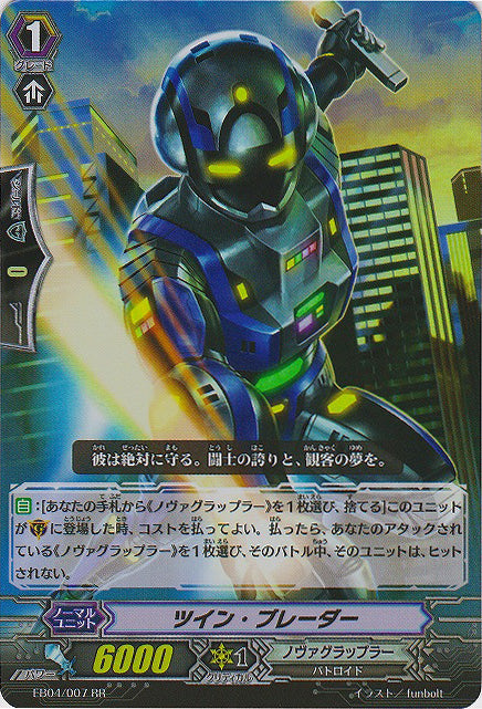 【永】:守護者(守護者はデッキに4枚までしか入れることができない)【自】:[あなたの手札から《ノヴァグラップラー》を1枚選び、捨てる]このユニットが(G)に登場した時、コストを払ってよい。払ったら、あなたのアタックされている《ノヴァグラップラー》を1枚選び、そのバトル中、そのユニットは、ヒットされない。
