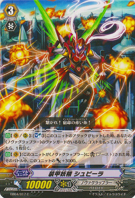 【自】【(V)/(R)】:[【ソウルブラスト】(3)]このユニットのアタックがヒットした時、あなたの《ノヴァグラップラー》のヴァンガードがいるなら、コストを払ってよい。払ったら、1枚引く。【自】【(V)】:このユニットが《ノヴァグラップラー》に【ブースト】された時、そのバトル中、このユニットのパワー+3000。