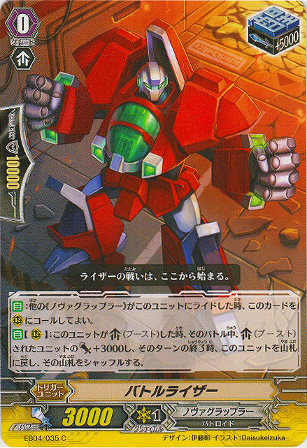 【自】:他の《ノヴァグラップラー》がこのユニットにライドした時、このカードを(R)にコールしてよい。【自】【(R)】:このユニットが【ブースト】した時、そのバトル中、【ブースト】されたユニットのパワー+3000し、そのターンの終了時、このユニットを山札に戻し、その山札をシャッフルする。