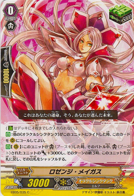 (【治】はデッキに4枚までしか入れられない。)【自】:他の《オラクルシンクタンク》がこのユニットにライドした時、このカードを(R)にコールしてよい。【自】【(R)】:このユニットが【ブースト】した時、そのバトル中、【ブースト】されたユニットのパワー+3000し、そのターンの終了時、このユニットを山札に戻し、その山札をシャッフルする。