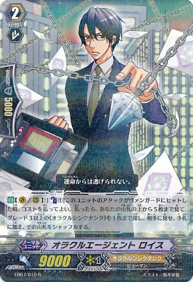 【自】【(V)/(R)】:[【カウンターブラスト】(1)]このユニットのアタックがヴァンガードにヒットした時、コストを払ってよい。払ったら、あなたの山札の上から5枚まで見て、グレード3以上の《オラクルシンクタンク》を1枚まで探し、相手に見せ、手札に加え、その山札をシャッフルする。