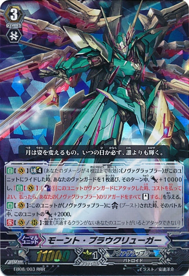 【自】【リミットブレイク】(4)(あなたのダメージが4枚以上で有効):《ノヴァグラップラー》がこのユニットにライドした時、あなたのヴァンガードを1枚選び、そのターン中、パワー+10000し、『【自】【(V)】:[【カウンターブラスト】(1)]このユニットがヴァンガードにアタックした時、コストを払ってよい。払ったら、あなたの《ノヴァグラップラー》のリアガードをすべて【スタンド】する。』を与える。【自】【(V)】:このユニットが《ノヴァグラップラー》に【ブースト】された時、そのバトル中、このユニットのパワー+2000。【永】【(V)/(R)】:盟主(共通するクランがないあなたのユニットがいるとアタックできない)