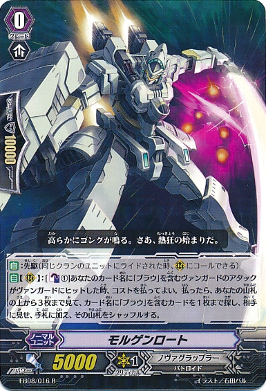 【自】:先駆(同じクランのユニットにライドされた時、(R)にコールできる)【自】【(R)】:[【カウンターブラスト】(1)]あなたのカード名に「ブラウ」を含むヴァンガードのアタックがヴァンガードにヒットした時、コストを払ってよい。払ったら、あなたの山札の上から3枚まで見て、カード名に「ブラウ」を含むカードを1枚まで探し、相手に見せ、手札に加え、その山札をシャッフルする。