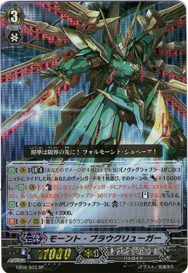 【自】【リミットブレイク】(4)(あなたのダメージが4枚以上で有効):《ノヴァグラップラー》がこのユニットにライドした時、あなたのヴァンガードを1枚選び、そのターン中、パワー+10000し、『【自】【(V)】:[【カウンターブラスト】(1)]このユニットがヴァンガードにアタックした時、コストを払ってよい。払ったら、あなたの《ノヴァグラップラー》のリアガードをすべて【スタンド】する。』を与える。【自】【(V)】:このユニットが《ノヴァグラップラー》に【ブースト】された時、そのバトル中、このユニットのパワー+2000。【永】【(V)/(R)】:盟主(共通するクランがないあなたのユニットがいるとアタックできない)