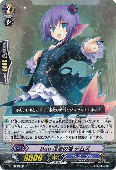 【自】:[【カウンターブラスト】(1)]このユニットが(R)から手札に戻された時、あなたのカード名に「Duo」を含むヴァンガードがいるなら、コストを払ってよい。払ったら、1枚引き、あなたの手札から「Duo 深海の城 テムズ」を3枚まで選び、公開してよい。3枚公開したら、あなたのダメージゾーンから1枚選び、表にする。