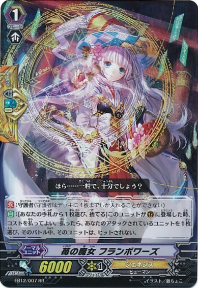 【永】:守護者(守護者はデッキに4枚までしか入れることができない)【自】:[あなたの手札から1枚選び、捨てる]このユニットが(G)に登場した時、コストを払ってよい。払ったら、あなたのアタックされているユニットを1枚選び、そのバトル中、そのユニットは、ヒットされない。