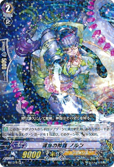 【自】:このカードがソウルからドロップゾーンに置かれた時、あなたのカード名に「神器」を含むヴァンガードを1枚選び、そのターン中、パワー+5000。