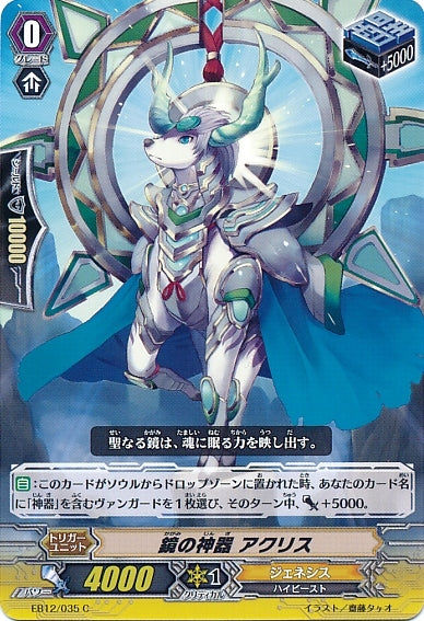【自】:このカードがソウルからドロップゾーンに置かれた時、あなたのカード名に「神器」を含むヴァンガードを1枚選び、そのターン中、パワー+5000。