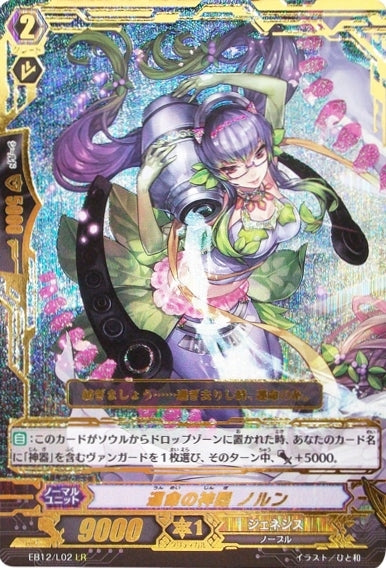 【自】:このカードがソウルからドロップゾーンに置かれた時、あなたのカード名に「神器」を含むヴァンガードを1枚選び、そのターン中、パワー+5000。
