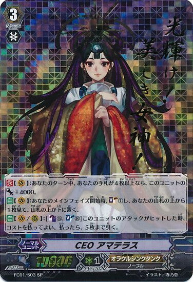 【永】【(V)】:あなたのターン中、あなたの手札が4枚以上なら、このユニットのパワー+4000。【自】【(V)】:あなたのメインフェイズ開始時、【ソウルチャージ】(1)し、あなたの山札の上から1枚見て、山札の上か下に置く。【自】【(V)/(R)】:[【カウンターブラスト】(5),【ソウルブラスト】(8)]このユニットのアタックがヒットした時、コストを払ってよい。払ったら、5枚まで引く。