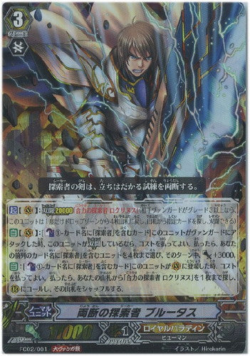 【起】【(V)】:【双闘20000】「合力の探索者 ロクリヌス」(相手ヴァンガードがグレード3以上なら、このユニットは1度だけドロップゾーンから4枚山札に戻し、山札から指定カードを探し、双闘できる)【自】【(V)】:[【カウンターブラスト】(1)-カード名に「探索者」を含むカード]このユニットがヴァンガードにアタックした時、このユニットが【双闘】しているなら、コストを払ってよい。払ったら、あなたの前列のカード名に「探索者」を含むユニットを4枚まで選び、そのターン中、パワー+3000。【自】:[【カウンターブラスト】(1)-カード名に「探索者」を含むカード]このユニットが(V)に登場した時、コストを払ってよい。払ったら、あなたの山札から「合力の探索者 ロクリヌス」を1枚まで探し、(R)にコールし、その山札をシャッフルする。
