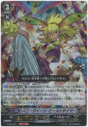 【起】【(V)】【リミットブレイク】(4):[【カウンターブラスト】(2)]あなたのカード名に、「ビーストテイマー」か「獣使い」を含むユニット1枚につき、あなたのソウルから1枚まで選び、別々の(R)にコールする。そのターン中、この能力は使えなくなる。【自】:このユニットが(V)に登場した時、あなたの山札から1枚探し、ソウルに置き、その山札をシャッフルする。