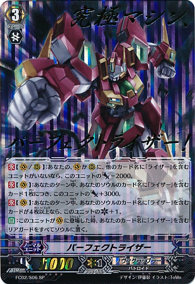 【永】【(V)/(R)】:あなたの、(V)か(R)に、他のカード名に「ライザー」を含むユニットがいないなら、このユニットのパワー-2000。【永】【(V)】:あなたのターン中、あなたのソウルのカード名に「ライザー」を含むカード1枚につき、このユニットのパワー+3000。【永】【(V)】:あなたのターン中、あなたのソウルのカード名に「ライザー」を含むカードが4枚以上なら、このユニットのクリティカル+1。【自】:このユニットが(V)に登場した時、あなたのカード名に「ライザー」を含むリアガードをすべてソウルに置く。