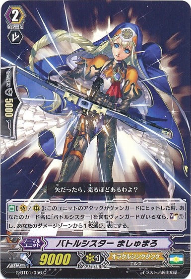 【自】【(V)/(R)】:このユニットのアタックがヴァンガードにヒットした時、あなたのカード名に「バトルシスター」を含むヴァンガードがいるなら、【ソウルチャージ】(1)し、あなたのダメージゾーンから1枚選び、表にする。