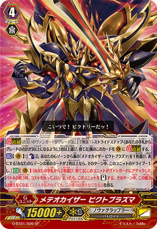 【超越】(お互いのヴァンガードがグレード3以上で解放!)-ストライドステップ-[あなたの手札からグレードの合計が3以上になるように1枚以上選び、捨てる]裏のこのカードを(V)に【超越】する。【起】【(V)】:[【カウンターブラスト】(2),あなたのGゾーンから裏の「メテオカイザー ビクトプラズマ」を1枚選び、表にする]あなたのGゾーンの表のカードが2枚以上なら、そのターン中、このユニットのドライブ-1し、『【自】【(V)】:[あなたの手札から2枚選び、捨てる]このユニットがヴァンガードにアタックしたバトルの終了時、コストを払ってよい。払ったら、このユニットを【スタンド】する。そのターン中、この能力は使えなくなる。(コストを払わなくても、この能力は使えなくなる)』を得る。