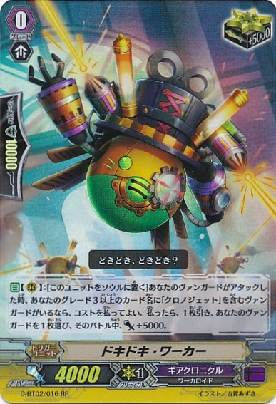 アップデート:シールド、トリガー、テキスト【自】【(R)】:「クロノジェット」を含むグレード3以上のあなたのヴァンガードがアタックした時、【コスト】[このユニットをソウルに置く]ことで、1枚引き、あなたのヴァンガードを1枚選び、そのバトル中、パワー+5000。【自】:このカードがダメージチェックで出た時、1枚引く。