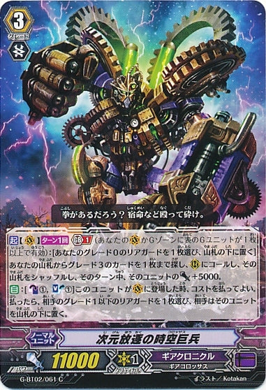 【起】【(V)】【ターン1回】【Gブレイク】(1)(あなたの(V)かGゾーンに表のGユニットが1枚以上で有効):[あなたのグレード0のリアガードを1枚選び、山札の下に置く]あなたの山札からグレード3のカードを1枚まで探し、(R)にコールし、その山札をシャッフルし、そのターン中、そのユニットのパワー+5000。【自】:[【カウンターブラスト】(1),【ソウルブラスト】(1)]このユニットが(V)に登場した時、コストを払ってよい。払ったら、相手のグレード1以下のリアガードを1枚選び、相手はそのユニットを山札の下に置く。