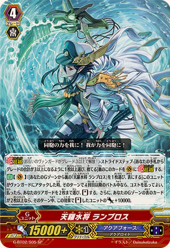 【超越】(お互いのヴァンガードがグレード3以上で解放!)-ストライドステップ-[あなたの手札からグレードの合計が3以上になるように1枚以上選び、捨てる]裏のこのカードを(V)に【超越】する。【自】【(V)】:[あなたのGゾーンから裏の「天羅水将 ランブロス」を1枚選び、表にする]このユニットがヴァンガードにアタックした時、そのターンで4回目以降のバトル中なら、コストを払ってよい。払ったら、あなたのリアガードを2枚まで選び、【スタンド】する。さらに、あなたのGゾーンの表のカードが2枚以上なら、そのターン中、この効果で【スタンド】したユニットのパワー+10000。