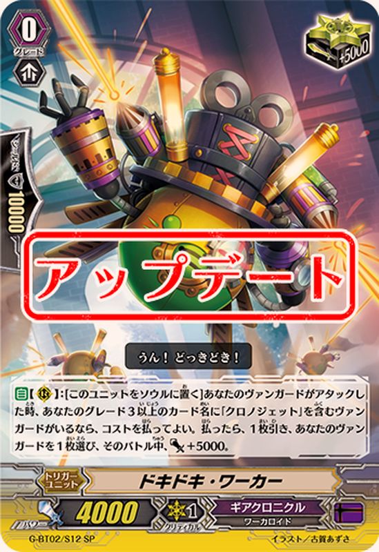 アップデート:シールド、トリガー、テキスト【自】【(R)】:「クロノジェット」を含むグレード3以上のあなたのヴァンガードがアタックした時、【コスト】[このユニットをソウルに置く]ことで、1枚引き、あなたのヴァンガードを1枚選び、そのバトル中、パワー+5000。【自】:このカードがダメージチェックで出た時、1枚引く。