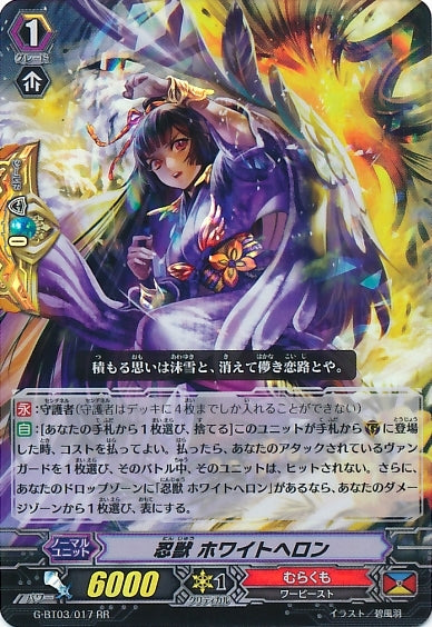 【永】:守護者(守護者はデッキに4枚までしか入れることができない)【自】:[あなたの手札から1枚選び、捨てる]このユニットが手札から(G)に登場した時、コストを払ってよい。払ったら、あなたのアタックされているヴァンガードを1枚選び、そのバトル中、そのユニットは、ヒットされない。さらに、あなたのドロップゾーンに「忍獣 ホワイトへロン」があるなら、あなたのダメージゾーンから1枚選び、表にする。