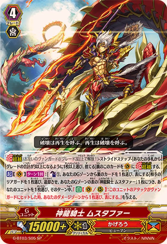 【超越】(お互いのヴァンガードがグレード3以上で解放!)-ストライドステップ-[あなたの手札からグレードの合計が3以上になるように1枚以上選び、捨てる]裏のこのカードを(V)に【超越】する。【起】【(V)】【ターン1回】:[【カウンターブラスト】(1),あなたのGゾーンから裏のカードを1枚選び、表にする]相手のリアガードを1枚選び、退却させ、あなたのGゾーンの表の「神龍騎士 ムスタファー」1枚につき、あなたのユニットを1枚選び、そのターン中、『【自】【(V)/(R)】:このユニットのアタックがヴァンガードにヒットした時、あなたのダメージゾーンから1枚選び、表にする。』を与える。