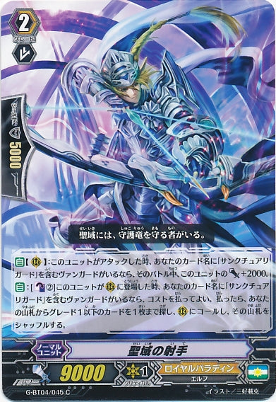 【自】【(R)】:このユニットがアタックした時、あなたのカード名に「サンクチュアリガード」を含むヴァンガードがいるなら、そのバトル中、このユニットのパワー+2000。【自】:[【カウンターブラスト】(2)]このユニットが(R)に登場した時、あなたのカード名に「サンクチュアリガード」を含むヴァンガードがいるなら、コストを払ってよい。払ったら、あなたの山札からグレード1以下のカードを1枚まで探し、(R)にコールし、その山札をシャッフルする。