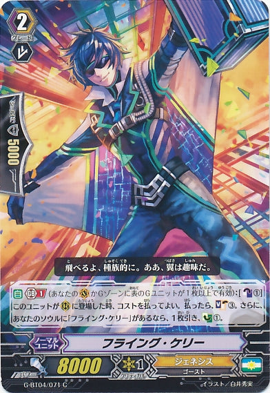 【自】【Gブレイク】(1)(あなたの (V)かGゾーンに表のGユニットが1枚以上で有効):[【カウンターブラスト】(1)]このユニットが(R)に登場した時、コストを払ってよい。払ったら、【ソウルチャージ】(3)。さらに、あなたのソウルに「フライング・ケリー」があるなら、1枚引き、【カウンターチャージ】(1)。
