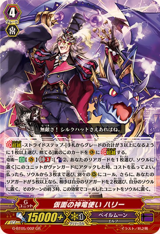 【超越】-ストライドステップ-[手札からグレードの合計が3以上になるように1枚以上選び、捨てる]裏のこのカードを(V)に【超越】する。奇術-【自】【(V)】【Gブレイク】(3):[【カウンターブラスト】(2),あなたのリアガードを1枚選び、ソウルに置く]このユニットがヴァンガードにアタックした時、コストを払ってよい。払ったら、ソウルから3枚まで選び、別々の(R)にコール。さらに、あなたのリアガードが5枚以上なら、相手は自分のリアガードを2枚選び、自分のソウルに置く。そのターンの終了時、この効果でコールしたユニットをソウルに置く。