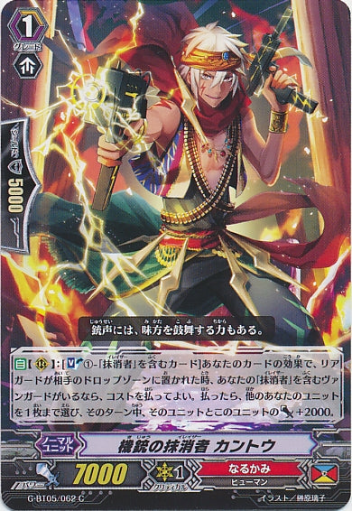 【自】【(R)】:[【ソウルブラスト】(1)-「抹消者」を含むカード]あなたのカードの効果で、リアガードが相手のドロップゾーンに置かれた時、あなたの「抹消者」を含むヴァンガードがいるなら、コストを払ってよい。払ったら、他のあなたのユニットを1枚まで選び、そのターン中、そのユニットとこのユニットのパワー+2000。