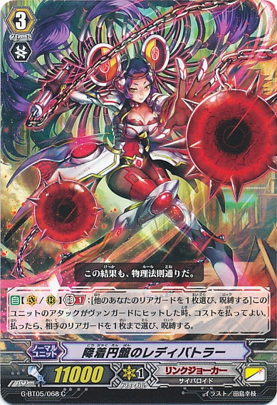 【自】【(V)/(R)】【Gブレイク】(1):[他のあなたのリアガードを1枚選び、呪縛する]このユニットのアタックがヴァンガードにヒットした時、コストを払ってよい。払ったら、相手のリアガードを1枚まで選び、呪縛する。