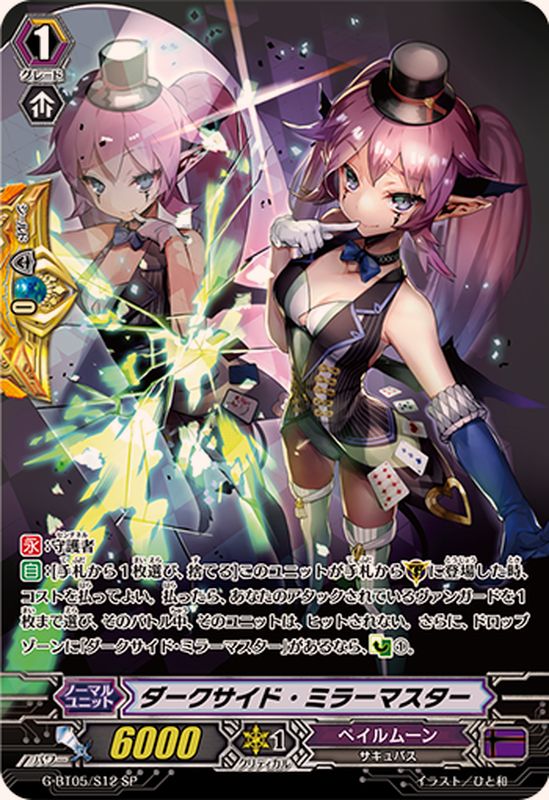 【永】:守護者【自】:[手札から1枚選び、捨てる]このユニットが手札から(G)に登場した時、コストを払ってよい。払ったら、あなたのアタックされているヴァンガードを1枚まで選び、そのバトル中、そのユニットは、ヒットされない。さらに、ドロップゾーンに「ダークサイド・ミラーマスター」があるなら、【カウンターチャージ】(1)。